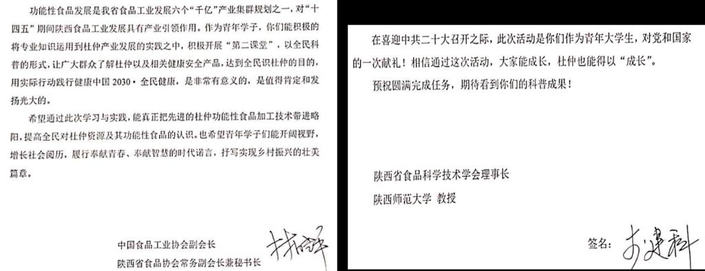自2022年7月9日,生命科学与食品工程学院举行了“献礼二十大•全民识杜仲,助力乡村振兴”暑期三下乡社会实践队启动仪式起,我院的情有独“仲”小分队队员们就纷纷开始行动,在多地掀起了“杜仲热”。活动受到了汉中市团委和留坝县团委的报道,也得到了中国食品工业协会副会长林小平、陕西省食品科学技术学会理事长李建科教授的赞许和肯定。