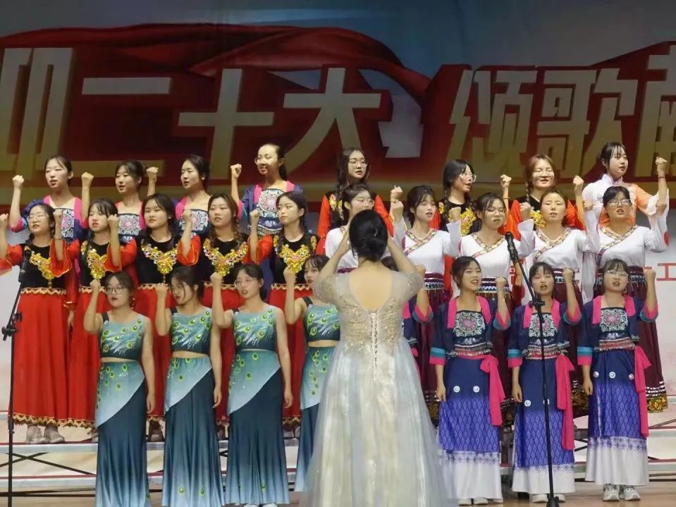 那鲜红的旗帜,正是指引我辈青年前进的灯塔,开场舞《我心中的红》,拉开了本次合唱比赛的帷幕。赛场上,各个班级将歌声带上舞台,将歌声与祖国紧密相连,在旋律、舞蹈、朗诵、琴音、口号的碰撞融合中,给观众带来了一场视听盛宴。飞扬的歌声,吟唱难忘的岁月,熟悉的旋律,演绎时代的激越,一首《我和我的祖国》道出无数中华儿女的心之所向;以青春之名诠释清澈挚爱,献礼建党百年华诞!一曲《万疆》,勾勒山河无恙的盛世景象;唱支山歌唱出亿万华夏儿女的心愿给党听,我把党来比母亲;母亲只生了我的身,党的光辉照我心,一首《唱支山歌给党听》;听,风在吼,马在叫,九曲黄河正将万顷波涛凝聚成一首雄壮的战歌!一曲《黄河大合唱》,表达了华夏儿女誓死保卫祖国的坚定决心……一声声歌唱祖国道出了对祖国母亲深深的爱,一曲曲红歌嘹亮唱出了意气风发的少年模样,一次次深情朗诵诉出了对红色精神的无悔传承。合唱比赛如火如荼地进行着,现场气氛在嘹亮的歌声中不断被推向高潮。