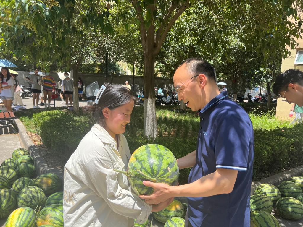走访过程中,权秋虎副书记与同学们展开了亲切的交谈,对同学们的学习生活环境高度重视,询问了宿舍用电情况和风扇使用情况,叮嘱同学们按时休息,注意防暑降温,并为同学们送上甘甜的西瓜。权书记表示学校正在积极协调,将克服一切困难尽快为学生解决空调使用问题。此外,权书记还深入了解了三年级同学们考研备考情况,了解到学生的复习进度,并向他们传达备考经验,希望同学们把握时间,科学备考,祝愿学子们都能成功“上岸”。