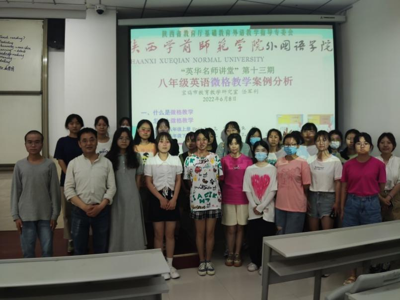2022年6月8日下午,外国语学院举办了第十三期 “英华名师讲堂”,特邀陕西省优秀教学能手工作站站长、宝鸡市教育教学研究室正高级教师任军利为我院学生做“八年级英语微格教学案例分析”的学术讲座,来自外国语学院2020、2021级英语专业本科生和《英语课程与教学论》的授课教师罗勇副教授参加了讲座。