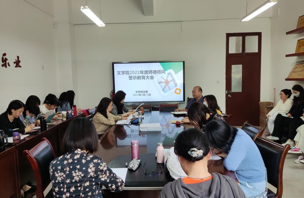 为进一步加强师德师风建设,树师德、正师风,5月11日中午,文学院在博文楼A211会议室组织召开2022年度师德师风警示教育大会,全体教职工参加会议。会议由学院党委书记杨阳主持。