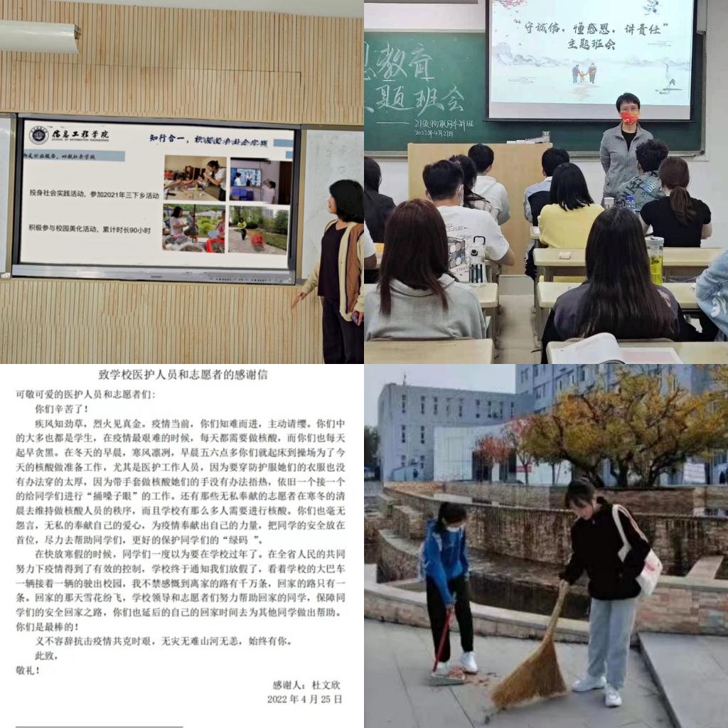 我院立足专业特点,设计虚拟信箱,以线上投稿的形式开展“说出我的感谢——感恩信箱”活动。此次活动同学们积极性强,参与度高,用最朴实的话语,最纯真的感情抒发出对祖国、父母、老师以及医护人员的感恩之心,颂扬了身边的动人事迹,引起广大学子的强烈共鸣。在“五一”劳动节来临之际,我院组织学生开展“我劳动、我快乐、我成长”为主题的志愿服务活动,通过美化校园、打扫教室以及宿舍整理等活动引导同学们通过动手参与,践行劳动精神,树立正确劳动价值观。