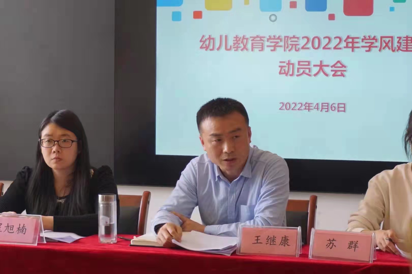 为提高学生的自律意识,营造优良的学习氛围,进一步加强学院学风建设,2022年4月6日下午14:30,幼儿教育学院于启真楼307会议室召开“学风建设”动员大会。为落实疫情防控相关政策,本次动员会采取线下主会场+线上分会场的形式进行。会议由院党委副书记苏群主持,院党委书记王继康、学工办主任程旭楠、各年级辅导员以及各班学生代表参加了此次会议。