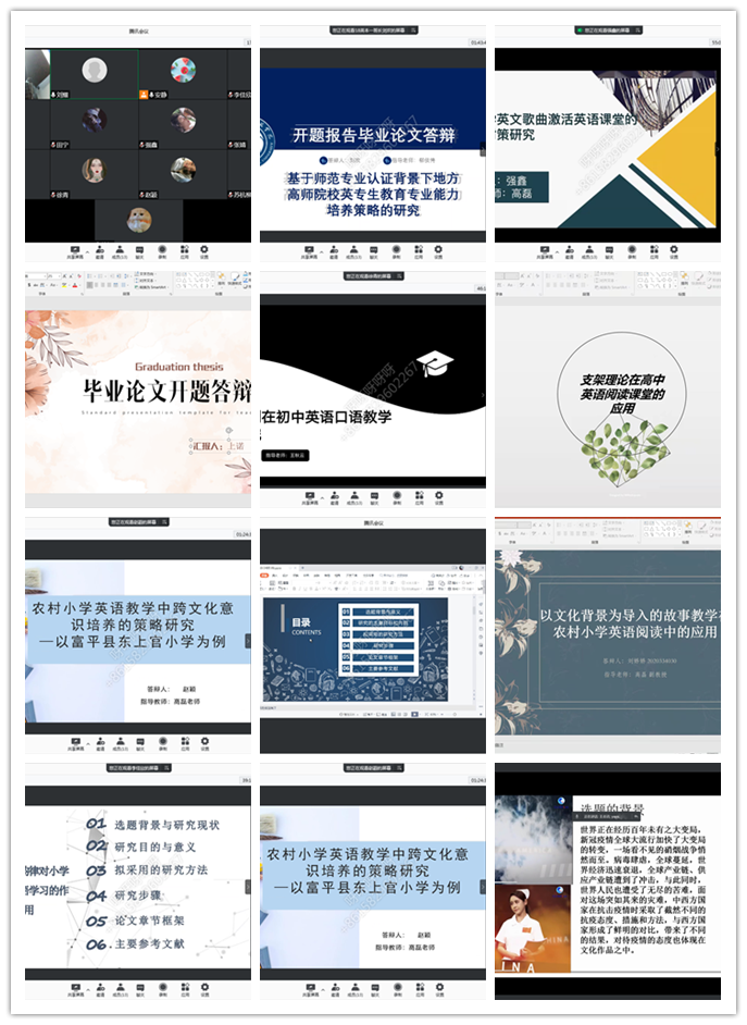 2021年12月29日,外国语院举行2022届英语专业毕业论文线上开题答辩。本次线上开题答辩共139名毕业生参加,答辩共分为十个小组,不同小组分别在腾讯会议不同时段进行,每组三到五名评审教师,每组组长均由教授或副教授担任。