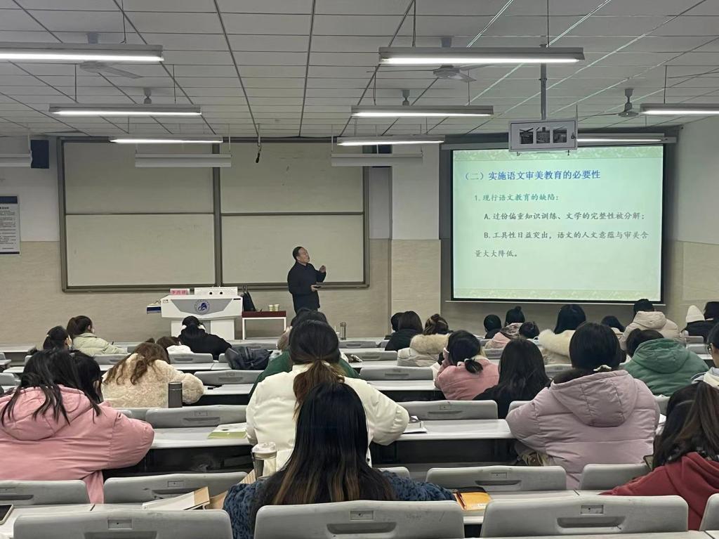 李西建教授结合师范生培养体系,做题为《语文审美教育思考》的讲座,讲座从三个层面展开:语文审美教育认识、实施思路和教学设计。他指出,语文审美教育引导师范生备课时有理可依,将语文教学内容作为审美艺术对象,能够充分发掘语文教材丰富的美学含量。段建军教授在《延安时期毛泽东审美共同体思想》报告中,从毛泽东审美共同体这一主题发端,围绕其产生前提与群众基础等内容进行剖析,结合中外文学作品,引经据典、旁征博引,结合具体文本进行分析与指导。两位教授清晰的理论框架、扎实的文学功底及独到的学术见解令在场师生受益匪浅。