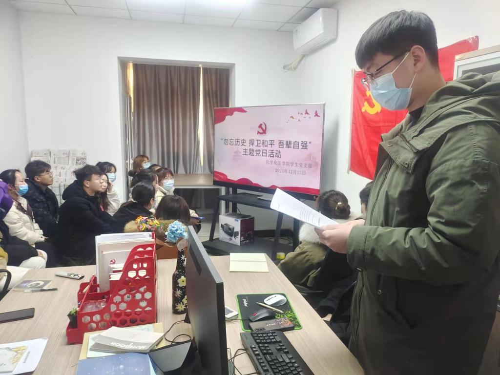 为悼念南京大屠杀死难者,缅怀为中国人民抗日战争胜利献出生命的革命先烈和民族英雄,引领青年学子弘扬爱国主义精神,铭记历史、勿忘国耻,化学化工学院于12月13日第八个南京大屠杀死难者国家公祭日,开展了“勿忘历史、捍卫和平、吾辈自强”主题党日活动,学生党支部全体党员、积极分子代表参加了本次活动。