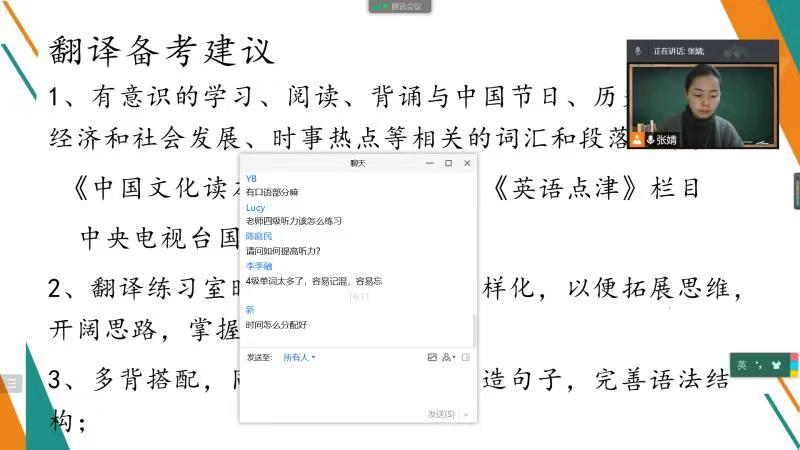 本次外国语学院举办的三场线上学法指导讲座,为新老学生和老师提供了一个很好的交流平台,学生反响热烈,在线提问积极踊跃,纷纷表示老师的讲解点面俱到,由浅入深,既有专业性又有实用性。通过此次活动,广大学生对大学阶段的英语学习和生活有了更明确的定位和目标,认识到应有针对性得投入到英语学习中,同时也激发了大家备考四级的信心和决心。