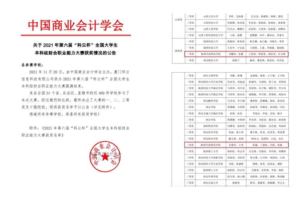 2021年11月20日,由中国商业会计学会主办的第六届“科云杯”全国大学生财会职业能力国赛圆满落下帷幕。best365官网经济与管理学院本科组两支参赛队伍分别荣获国赛一等奖和二等奖,高职组两支参赛队伍荣获国赛二等奖和三等奖,这是best365官网参加本项赛事以来获奖人数最多的一次。