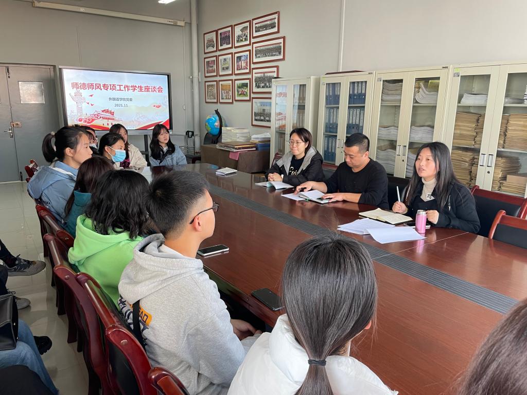 为进一步提升教育教学效果,持续深化师德师风建设活动,11月19日上午,外国语学院在博文楼C302会议室召开师德师风建设学生座谈会。学院党委副书记高海燕(主持工作)、侯文彬,辅导员李颖存、陈燃,30名各班级学生代表参加了座谈会。