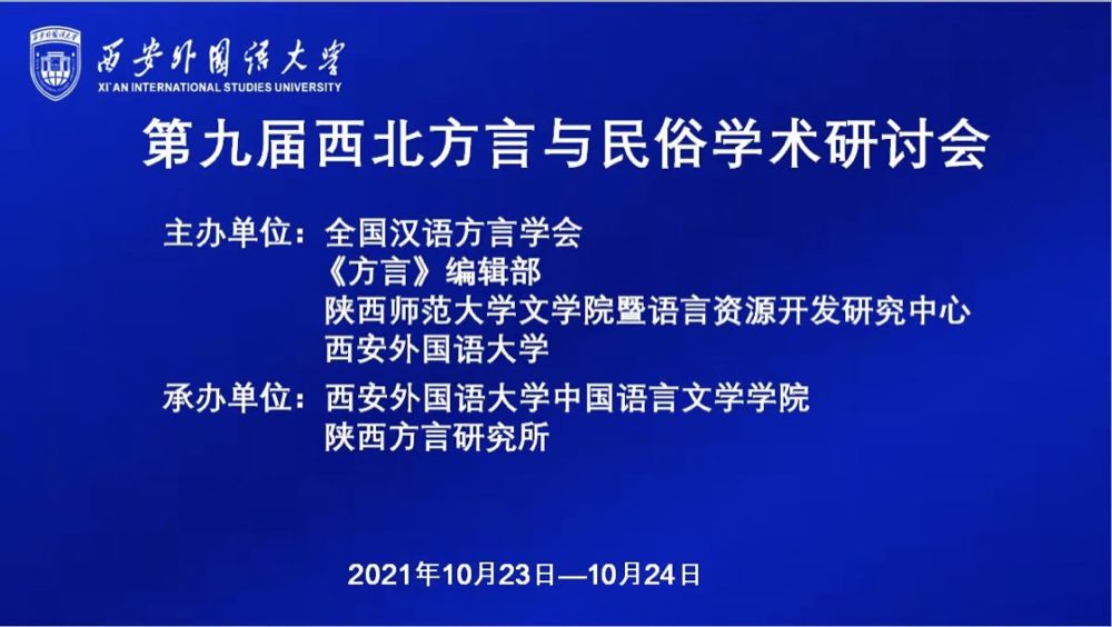 2021年10月23-24日,“第九届西北方言与民俗学术研讨会”在线上召开。会议由全国汉语方言学会、《方言》编辑部、陕西师范大学文学院语言资源开发研究中心和西安外国语大学主办,西安外国语大学中文学院、陕西方言研究所承办,best365官网文学院韩承红教授参会并提交题为《西北民间歌谣的调查和研究》的论文。