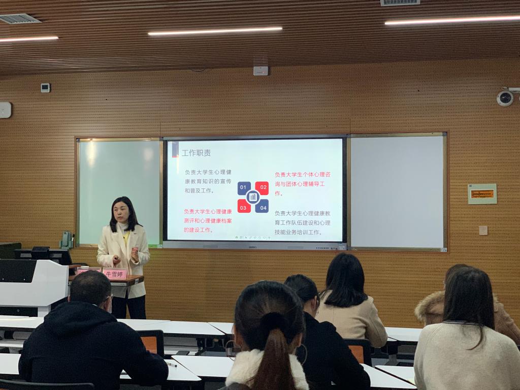 牛雪婷老师详细介绍了大学生心理健康指导中心的工作职责和办理事项,以及大学生心理健康教育的重要性。在大学生心理危机预防与干预方面牛雪婷老师指出学生应进行定期心理测评与约谈,对可能有问题的学生及时危机预警,而且要有干预措施,就此方面牛雪婷老师结合自身遇到的案例与新生辅导员进行了互动交流,分析了面对不同学生的心理问题应当如何处理。