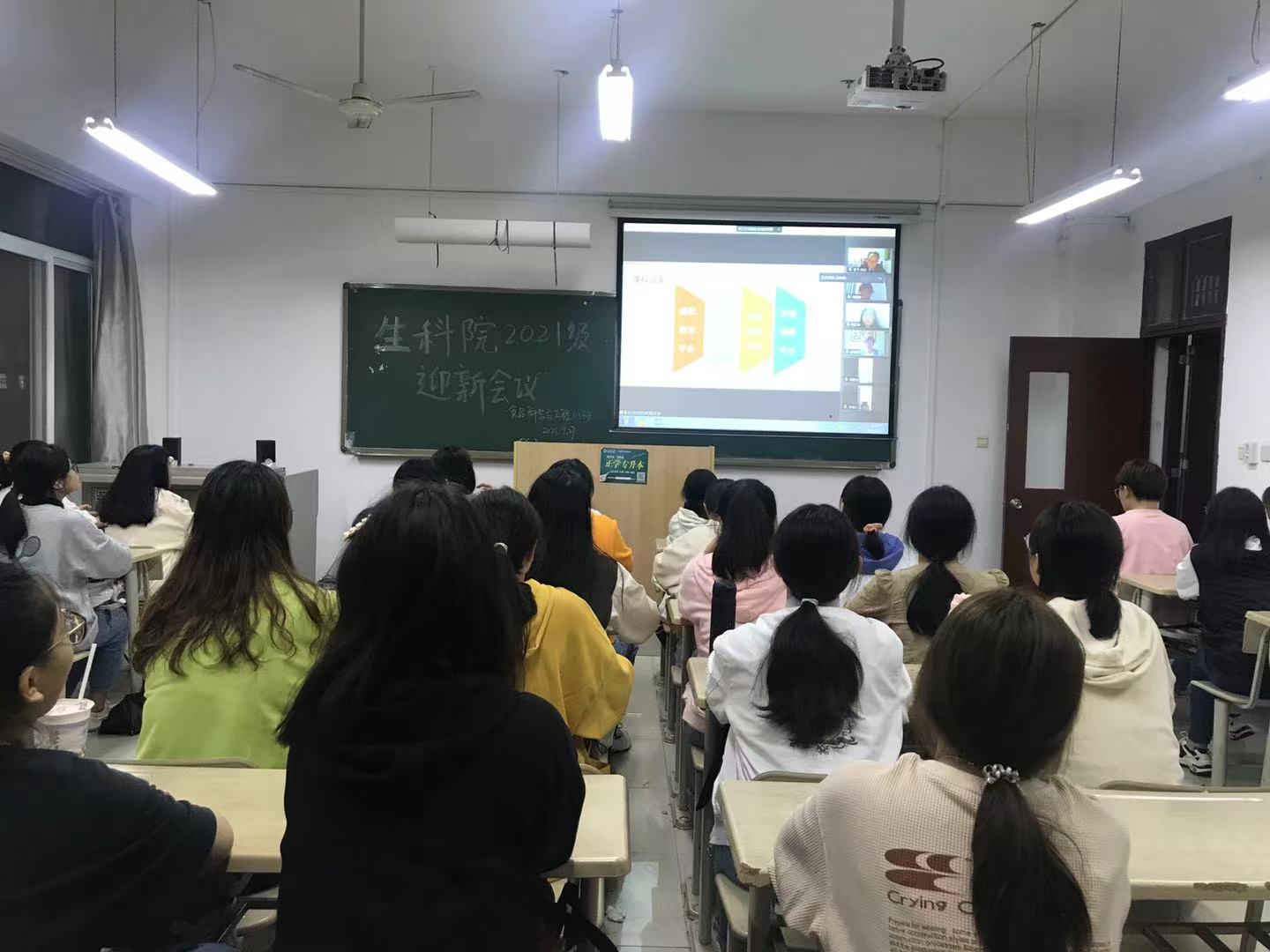 为使2021级新生能更好的适应大学生活,更深入了解学院的管理体系,加强对所学专业的认识,培养良好的学习习惯。2021年9月27日晚上19:00 - 20:00,生命科学与食品工程学院以线上、线下相结合的方式举行了2021级新生入学教育大会。院党委书记李飞,院长王立志及党政领导班子其它成员,各系主任、支部书记,师生代表,各年级辅导员和全体2021级新生参加了大会,会议由学院党委副书记郑美霞主持。