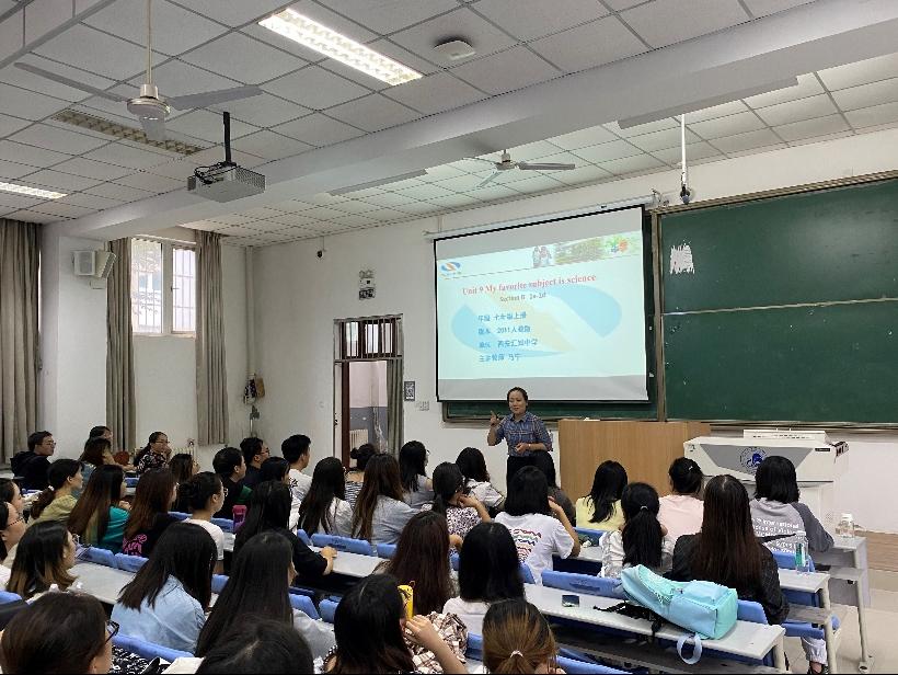 9月16日,在博文楼B1阶梯教室,针对学生真实课堂听课观摩经验不足地现状,外国语学院邀请我院2017届本科优秀毕业生、现任西安市第89中英语一年级组长的马宁老师返校给学生们进行了一堂生动的英语听说课示范展示。示范课后,由西安市教学能手、西安市骨干教师、碑林区教学能手,现任西安市第六中学初中英语教研组长的张晓萌老师给出了精彩的点评,并随后做了题为“初中英语听说课教学方法”的专题讲座。马宁老师以人教版7年级Unit 9 My favorite subject is science的Section B (2a-1d)为教本,通过展开猜词游戏、角色扮演、模仿对话等一系列活动,创设情景和有意义的任务活动,激发学生学习热情。随后张晓萌老师的点评精彩到位,不仅分析了这堂课的设计思路和展示效果,也谈到了可以提高的空间,并由此为契机,进行了英语听说课教学方法的主题探讨,让学生多角度的认识到一堂精彩的英语课背后教师需要下工夫和钻研的地方。