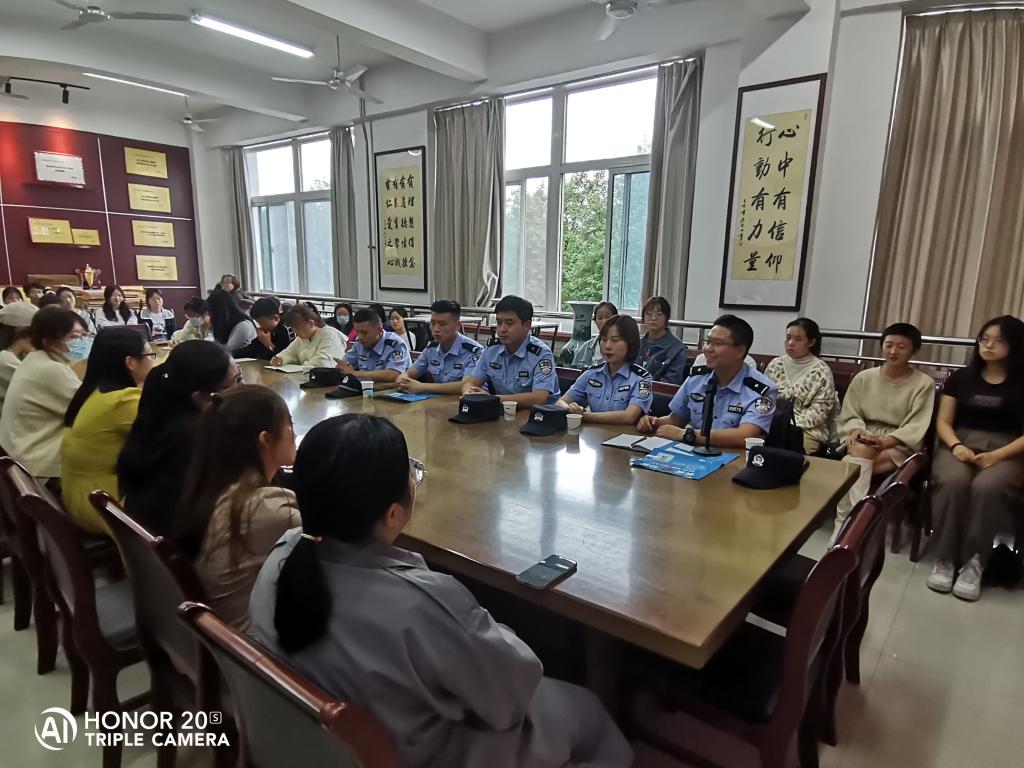 为提高师生反诈防骗能力,切实维护校园安全和师生财产安全,9月17日下午4:00,西安市长安区常宁派出所几位民警来到幼儿教育学院开展“反诈宣传教育”活动。党总支副书记苏群、各年级辅导员及70余名学生代表参与了此次宣传教育活动。
