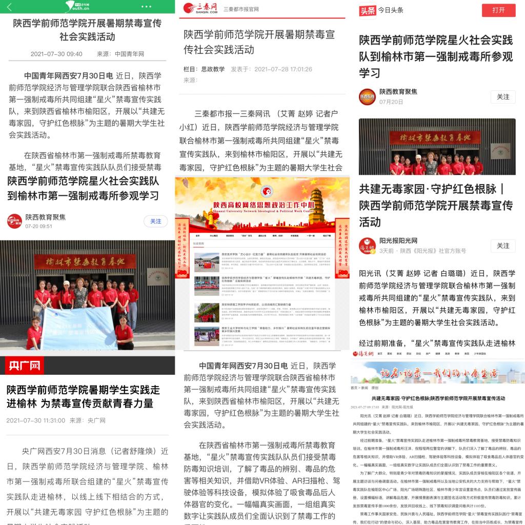 在此次实践活动中,队员们累计发放禁毒宣传手册1000余份,发放并回收有效问卷1103份,其中青少年问卷571份;成人问卷线下共532份。实践队的相关活动也受到社会媒体的高度关注,截至目前,受到央广网、中国青年网、陕西高校网络思想政治工作中心官方网站、三秦网、阳光报阳光网、今日头条、陕西教育聚焦等媒体的报道。