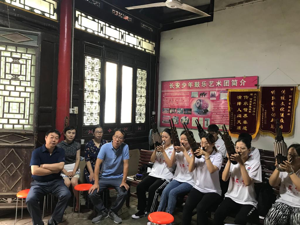 在慰问交流过程中,班子向何家营鼓乐社何忠信社长表达了谢意,感谢他长期支持长安鼓乐进校园课程建设和对学生实践活动的帮助。何社长带领班子参观了鼓乐社陈列馆,交流了长安鼓乐的发展历史。
