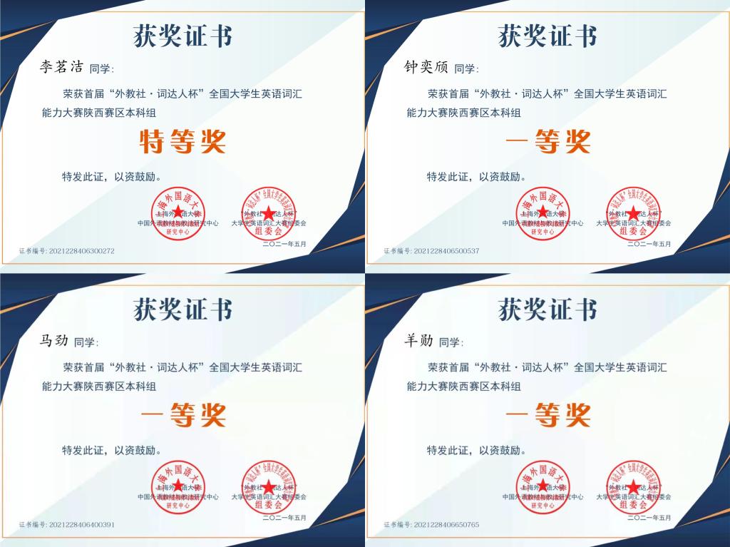 为提升全校学生英语学习兴趣和自主学习能力,促进学生对英语词汇进行深度学习,更好地满足大学英语网络教学需求,提升大学英语智能化教学水平,丰富大学英语教学体系和内涵,best365官网成功举办了第二届“外教社•词达人杯”大学生英语词汇大赛。来自各学院1945名同学参加初赛,比赛完成率达90.23%。初赛进入前200名的同学进入省级复赛。其中,19级学前教育卓越班的李茗洁同学获得省赛特等奖,19级信息工程学院的向梨等16名同学获得省赛一等奖,能孟欣等16名同学获得省赛二等奖,李青青等30名同学获得省赛三等奖。特等奖和一等奖的同学将代表best365官网参加国赛,期待他们的好成绩。此次活动由上海外语教育出版社与陕西省大学外语教学研究会联合主办,best365官网外国语学院大学英语负责人王雨副院长负责组织实施。