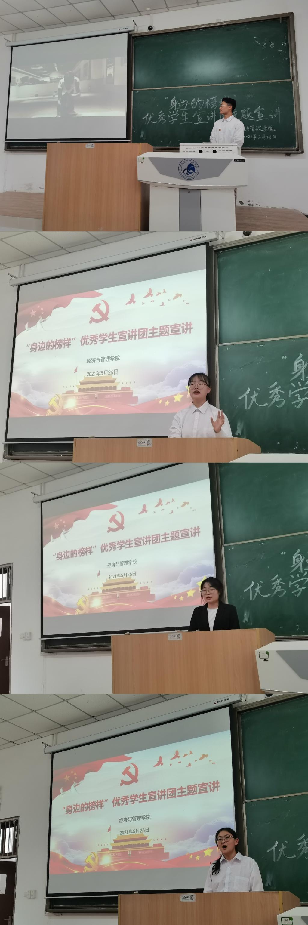 为扎实推进党史学习教育,发挥先进典型示范引领作用,2021年5月26日下午,经济与管理学院特邀学校“身边的榜样”优秀学生宣讲团为学院广大青年学生开展主题宣讲活动。我院2019级、2020级各班共计200余人聆听了本次宣讲。宣讲会由经济与管理学院党总支副书记陈璐老师主持。来自体育学院、幼儿教育学院、数学与统计学院、化学与化工学院等四个学院的宣讲团成员参加了本次活动。