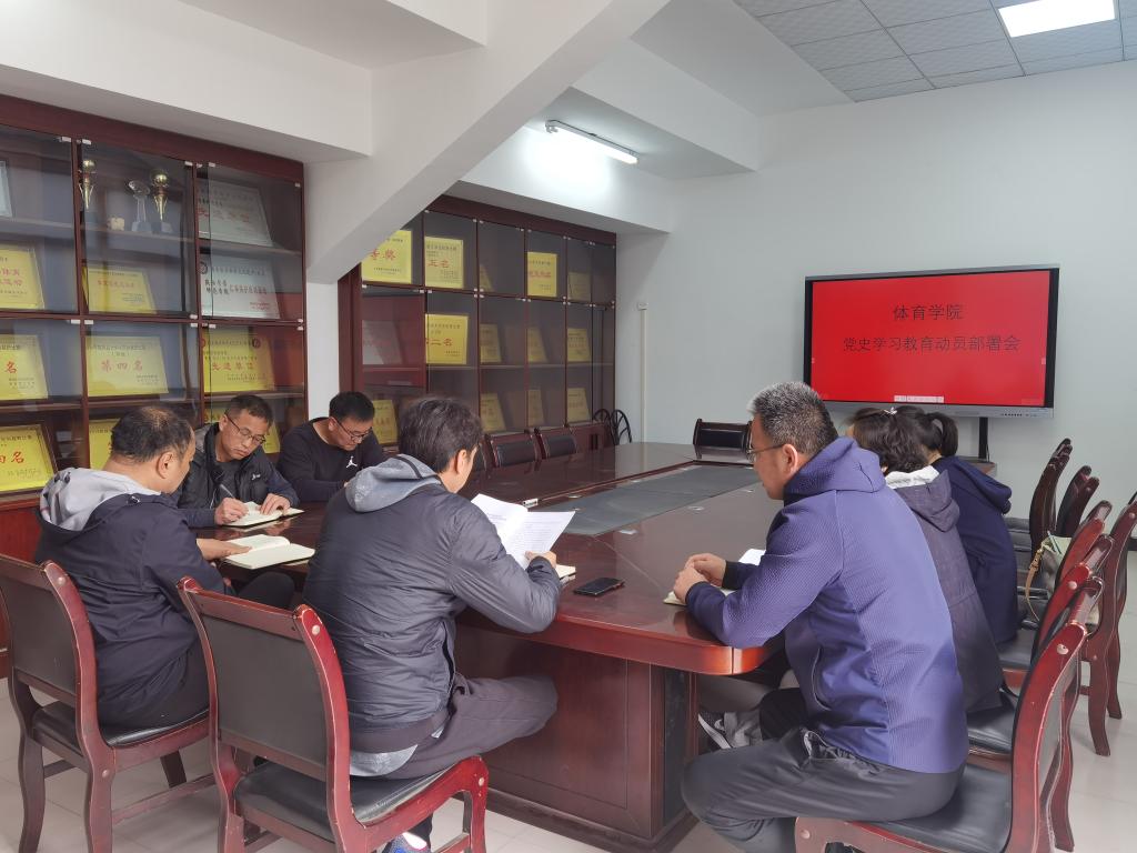 【体育学院】2021年4月7日下午2点,体育学院在田径场会议室召开党史学习教育动员部署会,会议由学院党总支副书记王伟(主持工作)主持,学院领导班子、各支部书记参加了本次动员部署会。