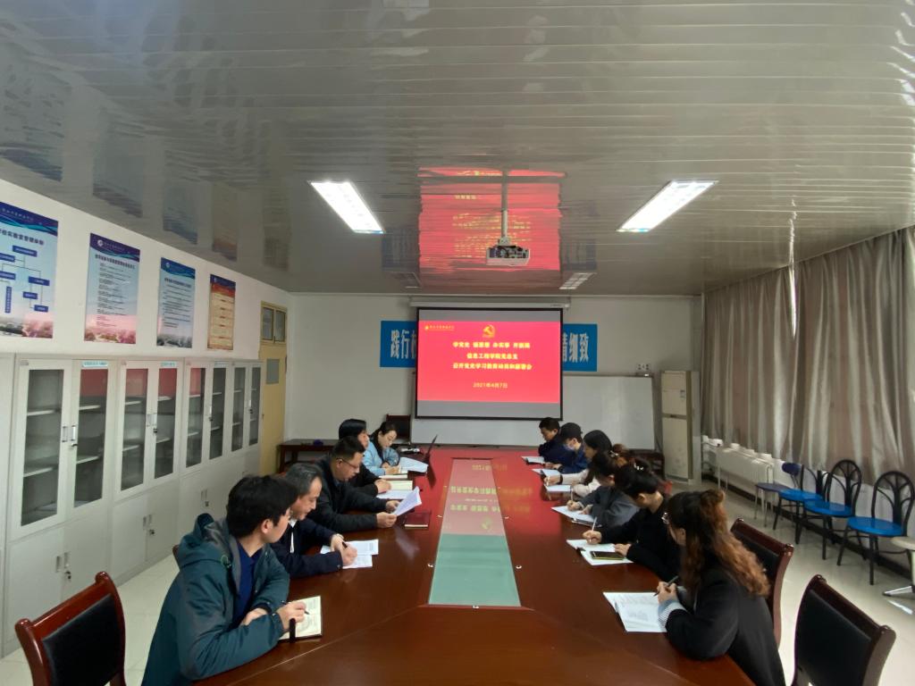 【信息工程学院】为深入贯彻落实习近平总书记在党史学习教育动员大会上的重要讲话精神,全面动员我院广大师生准确理解“学史明理、学史增信、学史崇德、学史力行”的科学内涵和核心要义,信息工程学院党总支于2021年4月7日下午,在积学楼A204会议室召开党史学习教育动员和部署会。会议由院党总支书记主持,院领导班子全体成员及各支部书记、教师党员参加。