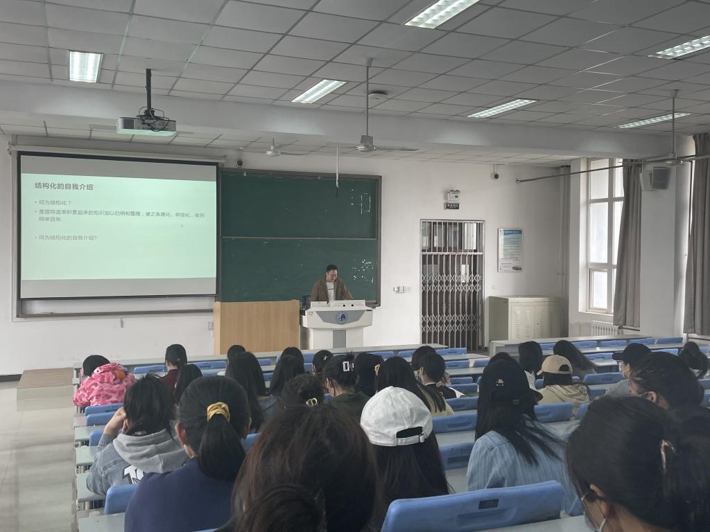 辅导员任晓春老师在就业讲座中,聚焦求职就业过程中相关面试环节注意事项,通过礼仪指导和学习结构化的自我介绍,引导同学们客观真实的展现自己,以最饱满的姿态去求职就业,做足就业准备。