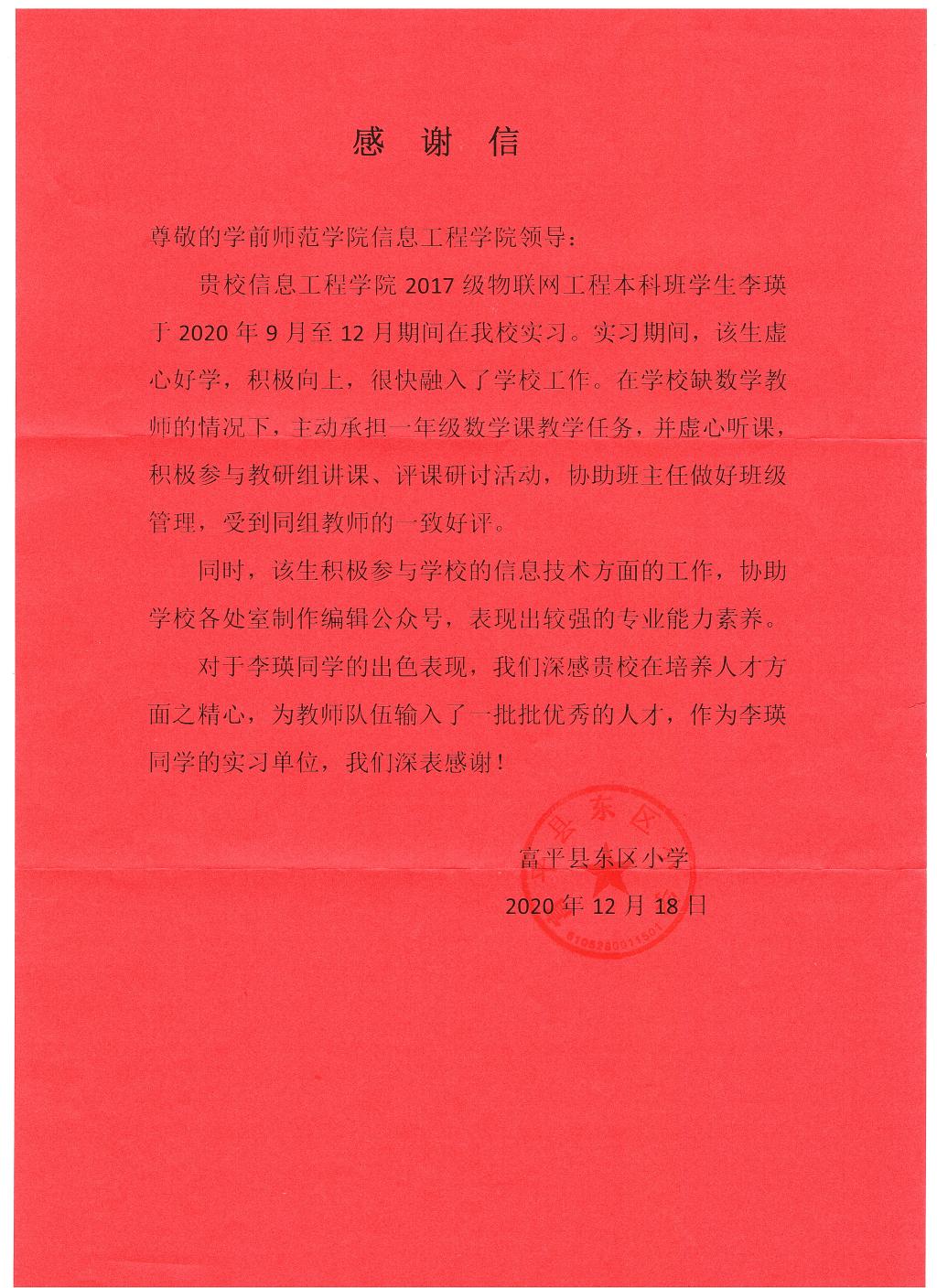 2020年12月18日,信息工程学院收到来自富平县东区小学感谢信,对实习学生的综合素质和我院的培养质量给与了充分肯定,特别对我院2017级物联网工程本科班学生李瑛表示感谢。