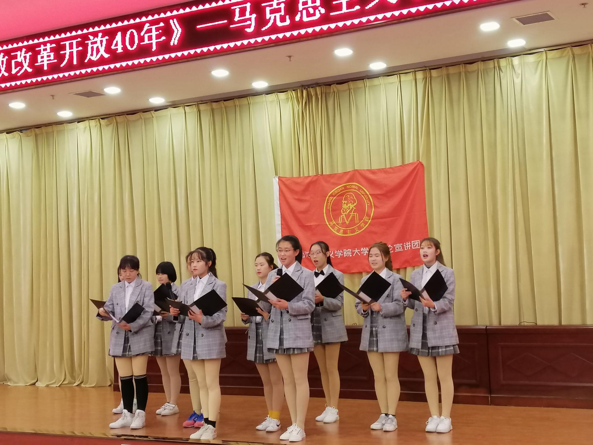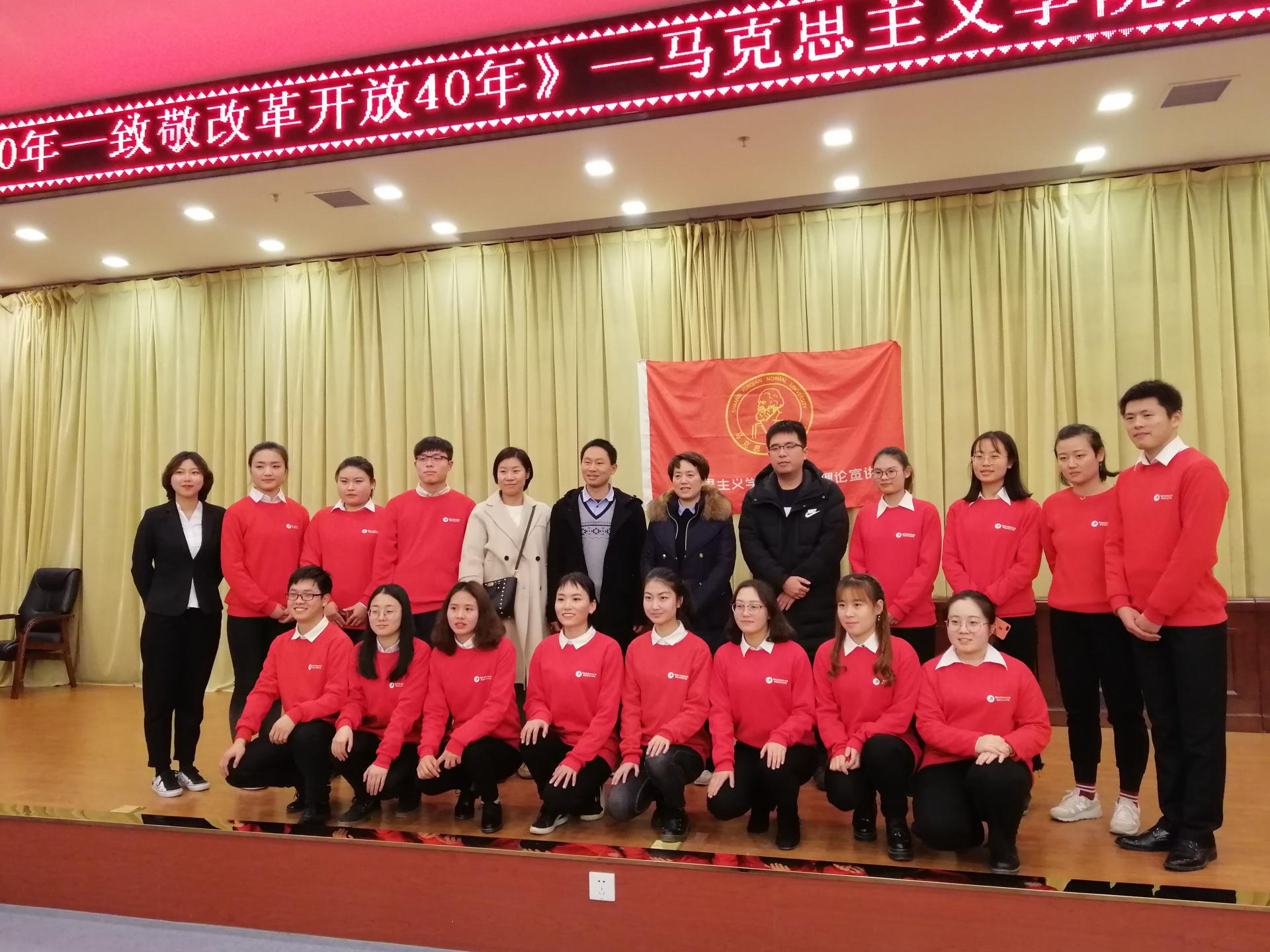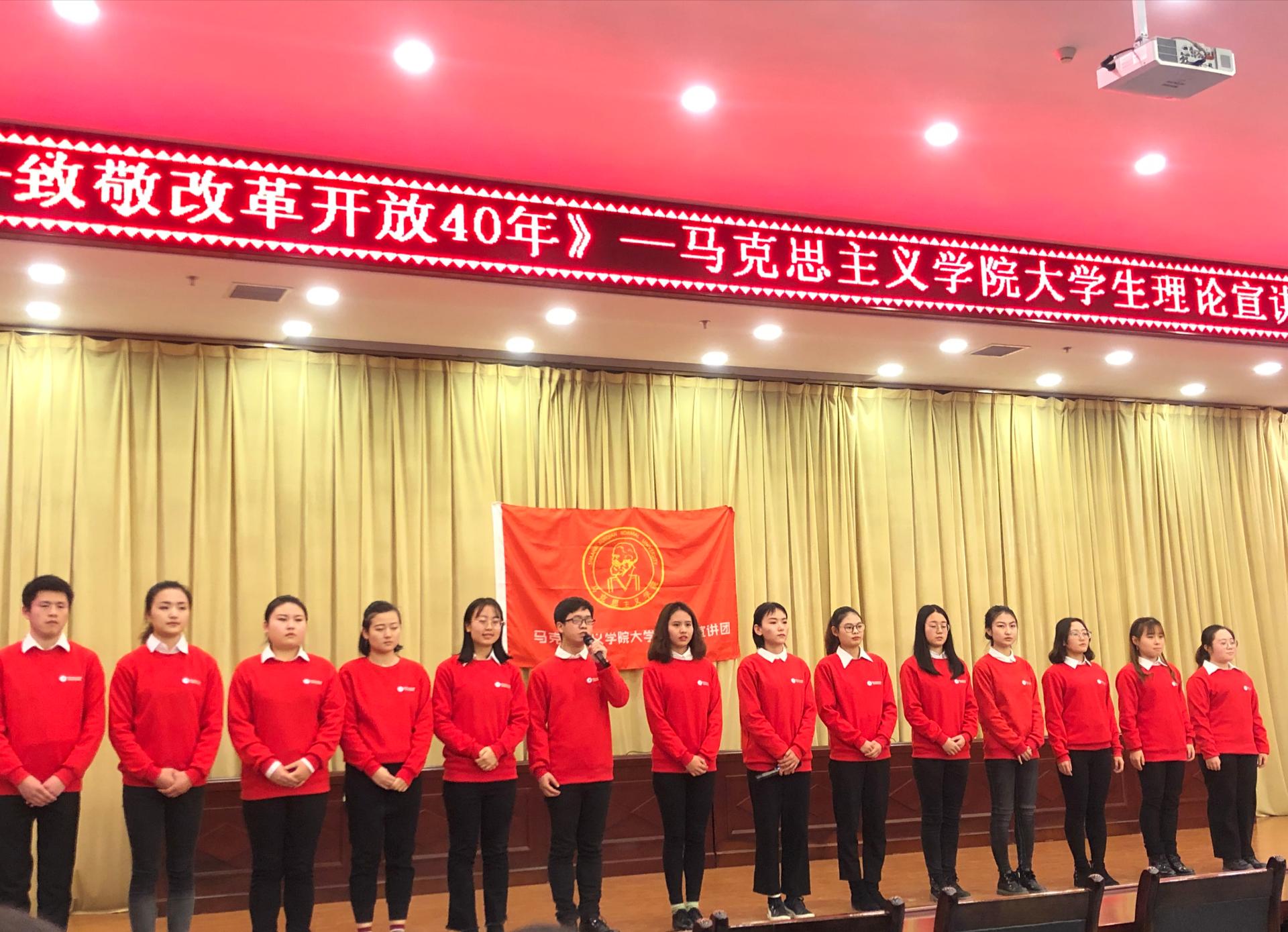 马克思主义学院大学生理论宣讲团在12月18日举办致敬“改革开放40周年”宣讲会恰逢其时。宣讲团将继续以讲好新思想、弘扬新时代精神为己任,在校内外传递正能量,带动全校青年学生学深悟透马克思主义理论和习近平新时代中国特色社会主义思想。