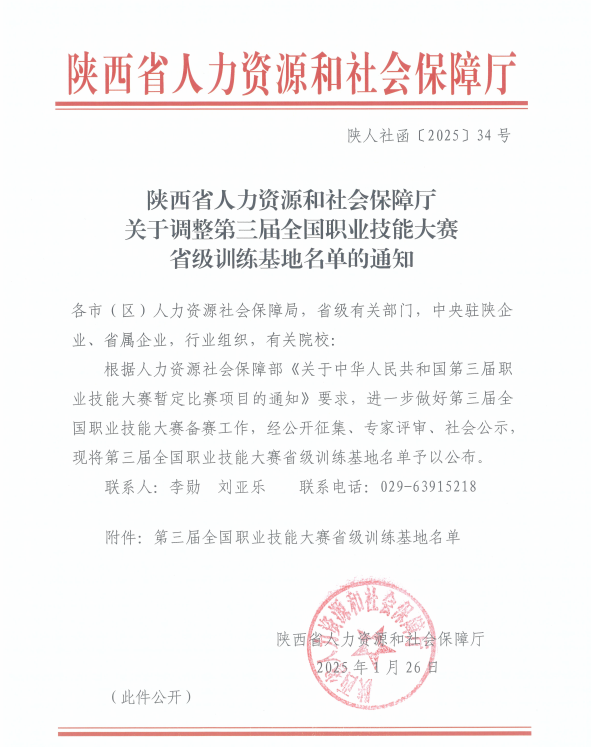 近日,陕西省人力资源和社会保障厅发布《关于调整第三届全国职业技能大赛省级训练基地名单的通知》(陕人社函【2025】34号),经公开征集、专家评审和社会公示程序,best365官网成功入选第三届全国职业技能大赛省级训练基地名单。