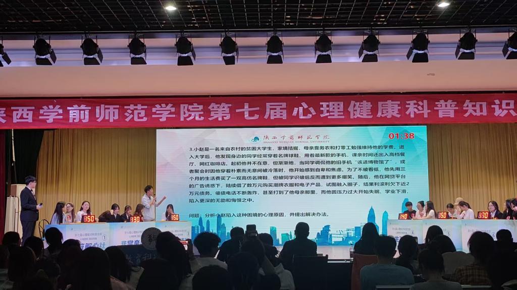 为贯彻落实省委教育工委关于开展第十届陕西高校“阳光护航”心理育人宣传季实践活动相关要求,深化心理健康知识普及,全面提升学生心理调适与抗压能力,4月15日晚上7点,由学工部大学生心理健康教育与指导中心主办第七届心理健康知识竞赛决赛在长安校区大学生活动中心顺利举办。决赛邀请经济与管理学院党委书记陈璐、外国语学院党委副书记侯文彬、信息工程学院党委副书记黄薇、体育学院党委副书记李强、学工部副部长王成富担任大赛评委,现场吸引了来自各学院的600余名学生前来观摩,共同见证这场知识与智慧的精彩碰撞。