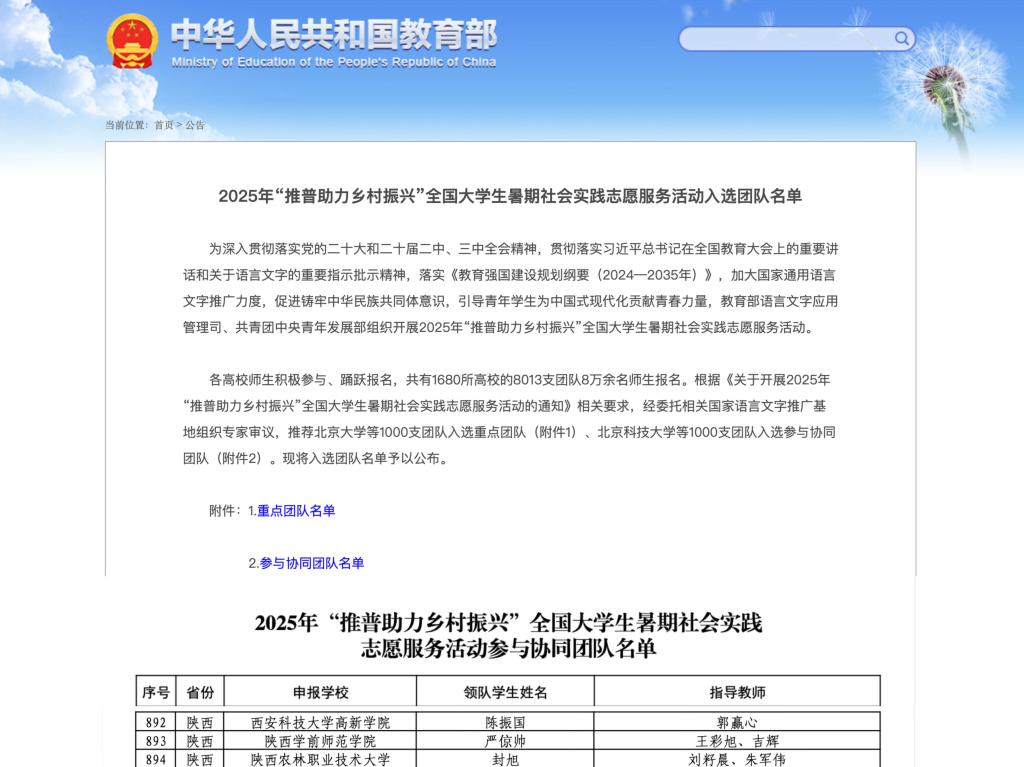 教育部公布了2025年“推普助力乡村振兴”全国大学生暑期社会实践志愿服务活动入选团队名单。人文学院“言蹊乡韵”实践团队成功入选为参与协同团队。