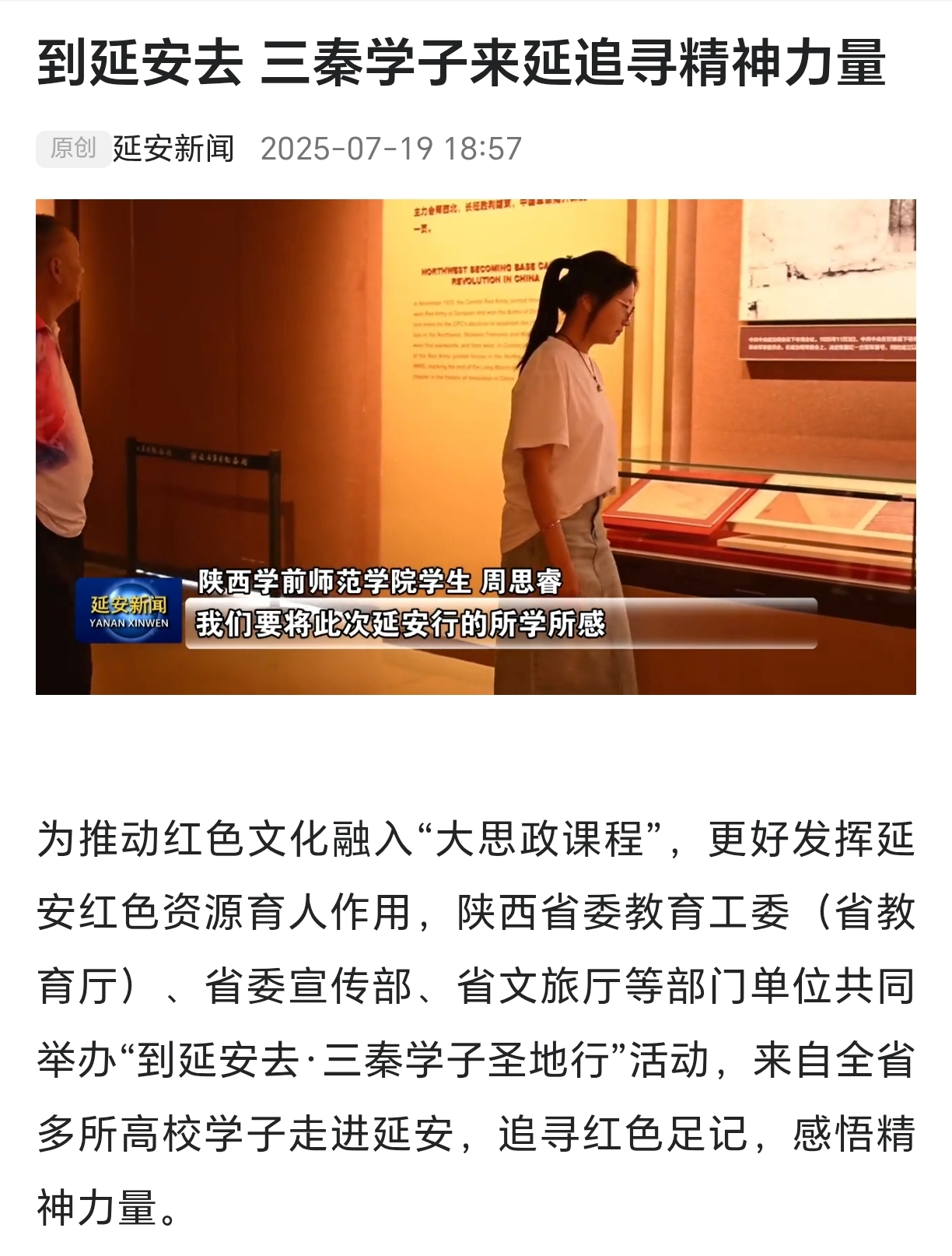 为深入贯彻落实党的二十大精神和习近平总书记关于“大思政课”、革命文物工作重要指示批示精神,推动革命文物资源深度融入“大思政课”建设,充分发挥其思想政治教育功能,由陕西省委宣传部、省委教育工委、省文物局联合开展的“新时代青年延安行,革命文物融入‘大思政课’”实践活动于近日圆满结束,作为参与单位,学校“圣地薪火,青春力行”暑期社会实践团队在活动中表现突出,活动成果及经验获得陕西电视台、延安电视台、西安电视台、学习强国平台、人民公开课等多家权威媒体报道。