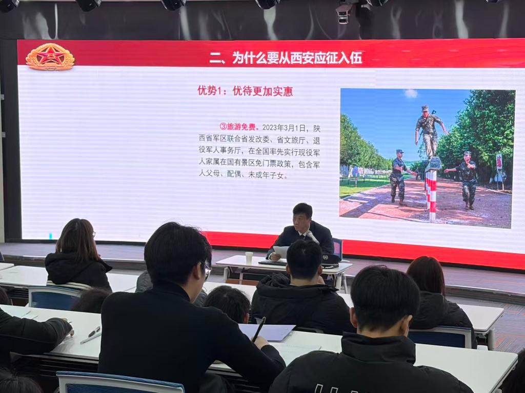 为深入贯彻落实征兵工作部署,引导有志青年投身国防和军队建设,近日,党委学生工作部(学生处、武装部)邀请雁塔区人民武装部相关工作人员来校开展2026年征兵政策专题宣讲会。全校80余名有意向参军的学生现场聆听政策解读,共话参军理想。宣讲会由雁塔区人武部军事科参谋崔俊意主讲。