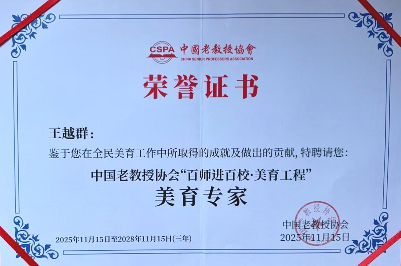 据悉,经省老教授协会遴选推荐,此次全省有10名权威教授、专家入选“中国老教授协会百师进百校美育专家库”。按照聘任工作要求,王越群教授今后将主导美育课程讲座、开展校际结对指导、参与示范性美育活动等工作,助力打造银龄美育与青少年美育“陕西样板”,以美育浸润心灵、赋能成长。此次受聘也为best365官网美育工作的拓展搭建了优质平台。